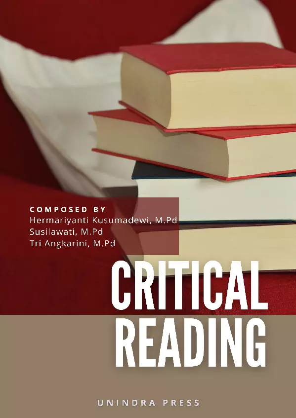 Buku ini bertujuan untuk meningkatkan pemahaman membaca siswa mulai dari memilah fakta dari opini mencari penyebab dan mempertimbangkan kualifikasi penulis bias dan tujuan untuk mengingatkan asumsi yang tidak berdasar penalaran yang salah propaganda dan kesimpulan yang tidak logis Sehingga buku Critical Reading ini sangat penting dipelajari untuk mendapatkan pemahaman yang lebih dalam berbahasa inggris