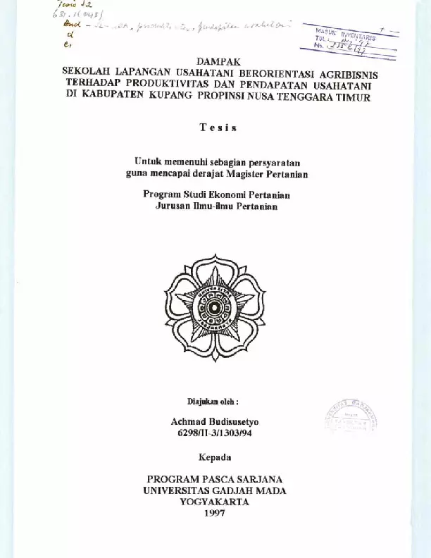 Dampak Sekolah Lapangan Usahatani Berorientasi Agribisnis Terhadap Produktivitas Dan Pendapatan Usahatani Di Kabupaten Kupang Propinsi Nusa Tenggara Timur Achmad Budisusetyo Fakultas Pertanian UGM Konten Lokal Konten Lokal 31126