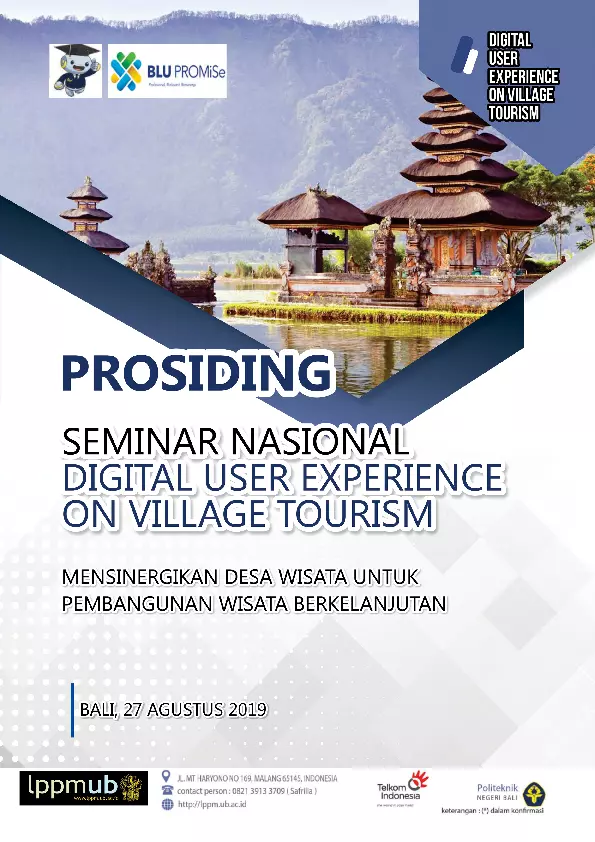 Buku ini menjelaskan tentang konsep dan pentingnya pengembangan wisata desa dalam konteks pembangunan wisata yang berkelanjutan. Seminar Nasional yang diselenggarakan pada 27 Agustus 2019 ini membahas peran teknologi digital dan pengalaman pengguna (user experience) dalam meningkatkan kualitas dan daya tarik wisata desa. Dalam buku ini, pembaca akan memahami bagaimana desa wisata dapat menjadi bagian dari upaya pembangunan yang berkelanjutan, sekaligus mendukung perekonomian lokal dan keberlanjutan lingkungan. Buku ini juga memberikan wawasan tentang strategi dan pendekatan yang dapat diterapkan untuk mengintegrasikan teknologi digital dalam pengelolaan wisata desa, sehingga mampu memberikan pengalaman yang lebih baik bagi pengunjung dan meningkatkan daya saing desa wisata di tingkat nasional.
