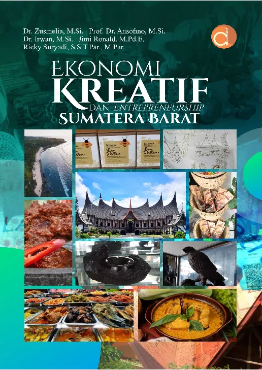 Buku yang berjudul Ekonomi Kreatif dan Entrepreneurship Sumatera Barat merupakan karya Irwan dkk Buku ini bertujuan untuk memetakan atau mentipologikan sumber daya manusia dalam pengembangan ekonomi kreatif EKRAF berbasis kearifan lokal dan digital di wilayah destinasi wisata Provinsi Sumatera Barat Pelaku ekraf menjadi unsur utama untuk pengembangan ekonomi kreatif dalam menjawab persoalan dunia saat ini terutama di pengembangan pariwisata dalam suatu wilayah yang diharapkan akan mampu meningkatkan pertumbuhan ekonomi dalam suatu wilayah baik di tingkat lokal hingga nasional Buku ini terdiri dari beberapa pembahasan diantaranya Pendahuluan Ekonomi Kreatif Sebuah Tinjauan Konseptual Masyarakat Matrilinileal dalam Ekonomi Kreatif Ekonomi Kreatif di Sumatera Barat Ekonomi Kreatif di sejumlah Destinasi Sektor Ekonomi Kreatif Sumatera Barat dan Wilayah Destinasi Wisata Sumatera Barat Pengetahuan dan Pengalaman Pelaku Ekraf dalam Pengembangan Ekonomi Kreatif di Destinasi Wisata Sumatera Barat