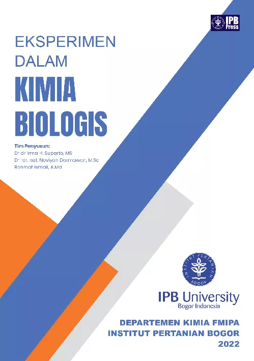 Buku penuntun praktikum ini merupakan buku panduan bagi mahasiswa terutama mahasiswa S 1 Departemen Kimia Fakultas Matematika dan Ilmu Pengetahuan Alam Institut Pertanian Bogor FMIPA IPB dalam melakukan praktikum Kimia Biologis Dengan berkembangnya keilmuan maka penuntun praktikum ini disempurnakan dengan topik bioinformatika Jenis jenis praktikum yang disampaikan berkaitan dengan peristiwa biologis yang berhubungan dengan kimia