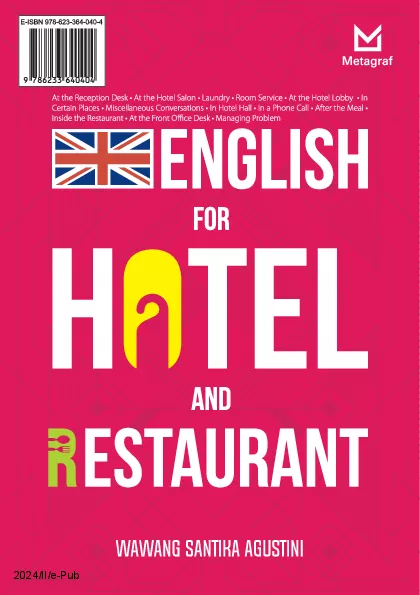 Buku ini memuat berbagai contoh dialog di lingkungan perhotelan dan restoran Mulai dari percakapan di meja resepsionis sampai menangani keluhan konsumen Berbagai dialog ini mudah dipelajari dan dipraktikkan Tak cuma itu dengan dilengkapi glosarium buku ini akan makin mempermudah para pekerja dan calon pekerja di bidang perhotelan dan restoran untuk menguasai bahasa Inggris Tak ada lagi alasan untuk tak terampil berbahasa Inggris saat berhadapan dengan tamu di hotel dan restoran