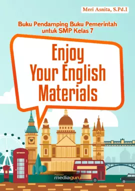 Sinopsis Buku Enjoy Your English Materials (Buku Pendamping Buku Pemerintah untuk SMP Kelas 7) Buku *Enjoy Your English Materials* merupakan buku pendamping yang dirancang untuk mendukung proses belajar mengajar bahasa Inggris di Sekolah Menengah Pertama (SMP) kelas VII. Buku ini disusun sesuai dengan Kurikulum 2013 Edisi Revisi 2016, dengan penekanan pada pembelajaran berbasis teks. Buku ini bertujuan untuk meningkatkan kemampuan siswa dalam menggunakan bahasa Inggris secara lisan dan tulisan, sekaligus memberikan wawasan tentang berbagai topik yang relevan dengan kehidupan sehari-hari. Buku ini dilengkapi dengan berbagai aktivitas yang menarik dan bermanfaat, seperti latihan penggunaan *subject pronoun* dan *object pronoun*, serta latihan menyusun dialog dan kalimat sederhana. Selain itu, buku ini juga memperkenalkan berbagai ekspresi dalam berbagai konteks, seperti salam, pamitan, ucapan terima kasih, dan permintaan maaf. Materi yang disajikan terstruktur secara jelas, sehingga memudahkan guru dan siswa dalam memahami dan mengimplementasikan konsep-konsep bahasa Inggris secara efektif. Dengan pendekatan yang interaktif dan praktis, *Enjoy Your English Materials* menjadi buku yang sangat membantu dalam memperkaya pemahaman siswa tentang bahasa Inggris, sekaligus memberikan kemudahan bagi guru dalam melaksanakan kegiatan pembelajaran. Buku ini dirancang untuk menjadi acuan yang komprehensif dalam upaya meningkatkan kualitas pembelajaran bahasa Inggris di tingkat SMP.