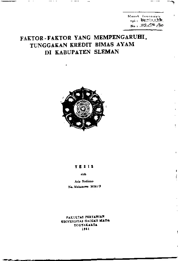 Faktor-Faktor Yang Mempengaruhi. Tunggakan Kredit Bimas Ayam Di Kabupaten Sleman Aris Budiono Fakultas Pertanian UGM Konten Lokal Konten Lokal 31357