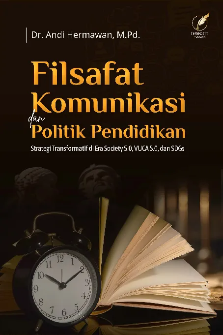 Era Society 5 0 dan VUCA 5 0 menuntut pendidikan yang adaptif dan visioner Tantangan global ketidakpastian dan percepatan teknologi menuntut guru kepala sekolah dan pemangku kepentingan pendidikan untuk memadukan filsafat komunikasi dan politik pendidikan dalam satu kerangka integratif Filsafat menjadi landasan nilai dan tujuan komu nikasi menjadi jembatan dialog kolaborasi dan diseminasi ilmu politik pendidikan menjadi instrumen legitimasi regulasi dan implementasi kebijakan Integrasi ketiganya membentuk pendidikan yang tidak hanya relevan dengan konteks global tetapi juga berakar pada kearifan lokal budaya dan nilai nilai bangsa Buku ini disusun dalam lima bagian utama Bagian I menekankan fondasi filosofis pendidikan dari perspektif klasik hingga kearifan lokal serta relevansinya dalam menghadapi perubahan zaman Bagian II menyo roti strategi komunikasi pendidikan yang humanis inklusif dan adaptif terhadap kemajuan teknologi Bagian III mengeksplorasi politik pendidikan sebagai arena distribusi kekuasaan keadilan dan kualitas pendidikan Bagian IV menyatukan ketiganya dalam model konseptual dan praktik terbaik yang konkret sedangkan Bagian V merancang roadmap pendidikan Indonesia hingga 2045 lengkap dengan indikator kuantitatif strategi filo sofis komunikasi dan politik yang harmonis