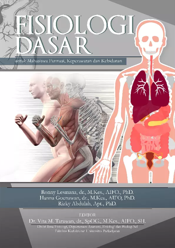 Buku ini disusun untuk memudahkan mahasiswa Fakultas Farmasi Ilmu Keperawatan dan Kebidanan mempelajari Ilmu Fisiologi Text book yang ada di perpustakaan semuanya dalam bahasa asing dan terasa masih kurang jumlahnya sedangkan jika mahasiswa harus membelinya sendiri tentu akan sangat mahal Sebagian besar text book masih menggabungkan antara anatomi dan fisiologi sehingga membuat aspek fisiologi nya menjadi tidak dibahas secara optimal Hal inilah yang mungkin menyebabkan pencapaian pengetahuan tentang fisiologi pada mahasiswa masih kurang memuaskan Buku ini terdiri dari 16 bab secara berurutan akan membahas tentang struktur dan fungsi sel jaringan kelenjar dan membran sistem muskular otot sistem pencernaan sistem endokrin sistem respirasi sistem urinarius kompartemen cairan tubuh imunitas dan alergi sistem saraf perofer sistem saraf pusat sistem kardiovaskular sistem reproduksi wanita sistem reproduksi pria darah dan sistem panca indera Pengetahuan tentang fisiologi dapat digunakan untuk memprediksi respon tubuh terhadap stimulus pada saat sehat ataupun sakit karena Fisiologi adalah ilmu yang mempelajari tentang proses dan fungsi tubuh