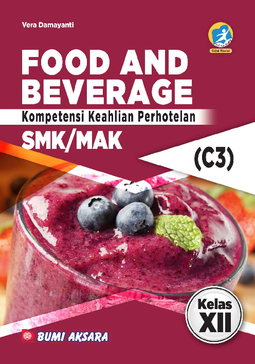 Buku ini ditulis sebagai salah satu sumber belajar siswa SMK MAK kelas XII untuk mempelajari dan memperdalam materi Food and Beverage Selain itu buku ini ditulis secara umum dalam rangka ikut serta mencerdaskan bangsa Indonesia di era globalisasi dalam perkembangan ilmu pengetahuan dan teknologi Buku ini disusun berdasarkan Peraturan Direktur Jenderal Pendidikan Dasar dan Menengah Kementerian Pendidikan dan Kebudayaan Nomor 464 D D5 KR 2018 tentang Kompetensi Inti dan Kompetensi Dasar Mata Pelajaran Muatan Nasional A Muatan Kewilayahan B Dasar Bidang Keahlian C1 Dasar Program Keahlian C2 dan Kompetensi Keahlian C3 Anda dapat mempelajari buku ini sebelum dan sesudah dibahas oleh guru dan dapat mendiskusikannya dengan teman agar mendapatkan hasil belajar yang maksimal Setiap bab dalam buku ini dilengkapi dengan Kompetensi Dasar Kata Kunci Peta Konsep Tugas Info Rangkuman Refleksi Diri Soal Latihan dan Proyek Soal latihan diberikan beberapa jenis setelah akhir bab dan setiap akhir semester Pembahasan materi disajikan dengan bahasa yang lugas dan mudah kita pahami dari pembahasan secara umum ke pembahasan secara khusus Sebelum membaca rangkuman materi diharapkan Anda membuat rangkuman sendiri terlebih dahulu yang nantinya dibandingkan dengan rangkuman dalam buku Dengan demikian Anda dapat membandingkan pokok materi yang dianggap penting untuk dirangkum dan meningkatkan pemahaman Anda Pada akhir buku juga dilengkapi dengan Glosarium dan Indeks