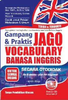 Sinopsis Buku Gampang & Praktis Jago Vocabulary Buku *Gampang & Praktis Jago Vocabulary* merupakan panduan praktis dan efektif untuk meningkatkan kemampuan vocabulary dalam bahasa Inggris. Buku ini dirancang khusus untuk pembelajar pemula yang ingin meningkatkan penguasaan kata dalam waktu 9 minggu. Buku ini terdiri dari 9 minggu pelajaran yang disusun secara sistematis, dengan fokus pada satu skill setiap minggunya, sehingga memudahkan pembelajaran secara bertahap dan terstruktur. Dalam setiap minggu, pembaca akan mempelajari berbagai konsep vocabulary seperti sinonim, antonim, homofon, kata dasar, prefik, sufik, kata-kata berkaitan, arti kata dari konteks, analogi, pembuatan word maps dan word webs, bentuk jamak kata benda, serta penggunaan kamus dan tesaurus. Buku ini juga membahas konsep dasar kelas kata (*part of speech*) seperti *noun, verb, adjective, adverb, preposition, conjunction, article*, dan *pronoun*, serta memberikan contoh nyata untuk memudahkan pemahaman. Selain itu, buku ini juga memberikan tips praktis tentang cara belajar vocabulary yang efektif, seperti belajar secara konsisten, menggunakan vocabulary dalam kehidupan sehari-hari, dan membuat catatan vocabulary untuk memperkuat ingatan. Buku ini sangat cocok untuk meningkatkan kemampuan berbicara, membaca, dan menulis dalam bahasa Inggris, serta membantu dalam menghadapi ujian seperti TOEFL, TOEIC, atau IELTS. Dengan pendekatan yang mudah dan praktis, *Gampang & Praktis Jago Vocabulary* menjadi alat yang sangat berguna bagi siapa pun yang ingin memperluas vocabulary dan meningkatkan kemampuan berbahasa Inggris secara efektif dan menyenangkan.