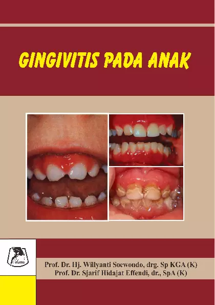 Karya tulis yang diterbitkan dalam bentuk buku kecil ini ditulis untuk membantu para pembaca memperoleh informasi ilmu pengetahuan tentang bagaimana memelihara kesehatan gigi dan mulut pada pasien anak berkebutuhan khusus Substansi buku diawali dengan isi tentang pengertian macam macam tipe dan penyakit gingival yang umum terjadi pada anak patofisiologi dan penanggulangan gingivitis pada anak Sistematika penulisannya adalah sebagai berikut Bab 1 Pendahuluan Bab 2 Anatomi dan Histopatologi Bab 3 Gingivitis pada anak Bab 4 Penanggulangan Gingivitis pada anak