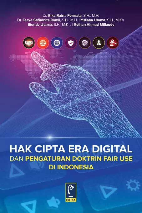 Buku Hak Cipta Era Digital dan Pengaturan Doktrin Fair Use di Indonesia ini membahas kekayaan intelektual khususnya mengenai perlindungan hak cipta dengan penerapan fair use Fair use penggunaan wajar telah lama menimbulkan diskursus tentang ruang lingkup penerapan dan tempatnya dalam Undang Undang Nomor 28 Tahun 2014 tentang Hak Cipta Fair use didasarkan pada prinsip bahwa pencipta harus memiliki hak properti untuk mendorong pembangunan tetapi masyarakat harus memiliki hak untuk menggunakan karya tertentu untuk sepenuhnya mewujudkan visi kreatif suatu karya hak cipta Di dalam buku ini juga membahas kasus kasus hak cipta di era digital Buku ini layak untuk dibaca dan dipelajari baik oleh kalangan akademisi mahasiswa bahkan oleh praktisi yang bergerak didalam bidangnya sebagai bahan acuan referensi terkait Hak Cipta Era Digital dan Pengaturan Doktrin Fair Use di Indonesia