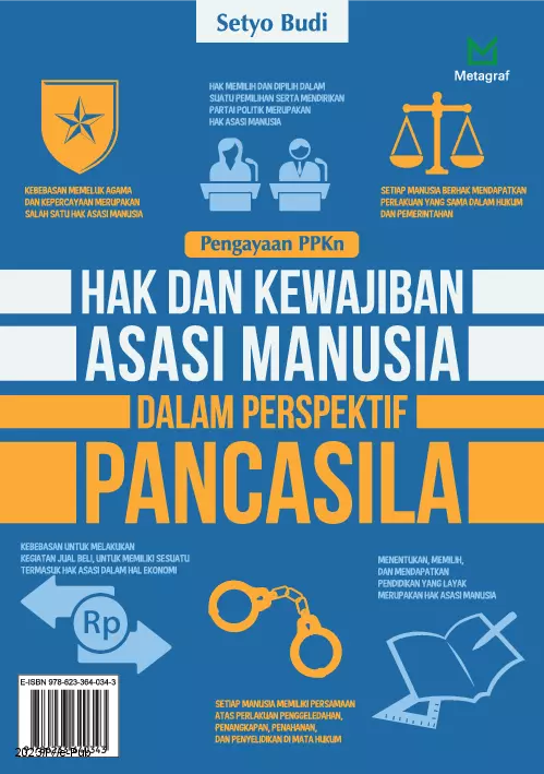 Perlindungan terhadap hak asasi manusia HAM merupakan salah satu masalah yang paling sering dibahas dalam kehidupan berbangsa dan bernegara di masa sekarang Hal itu karena masih banyaknya pelanggaran HAM yang terjadi di berbagai belahan dunia Di Indonesia negara yang menggunakan dasar dan ideologi Pancasila persoalan mengenai HAM merupakan masalah yang tak kalah kompleksnya Pemahaman rakyat terhadap Pancasila sebagai dasar dan ideologi negaranya masih perlu ditingkatkan Demikian juga dengan kesadaran rakyat untuk menerapkan nilai nilai Pancasila dalam kehidupan sehari hari Pemahaman yang benar mengenai Pancasila akan membuat suasana penegakan HAM di Indonesia menjadi selaras karena pelaksanaan hak dan kewajiban asasi manusia di Indonesia akan selalu dihubungkan dengan ideologi dan dasar negara Buku pengayaan ini akan memberikan penjelasan rinci mengenai permasalahan tersebut Harapannya buku ini dapat membantu memberikan solusi pemahaman dan kesadaran bersama mengenai Negara Indonesia yang berdasarkan Pancasila dalam hubungannya dengan HAM Buku ini juga membahas tentang konsep HAM substansi kewajiban dan hak asasi manusia dalam Pancasila serta sekilas pembahasan mengenai kasus kasus HAM yang dapat dijadikan bahan pembelajaran Buku ini layak dibaca oleh masyarakat umum pelajar guru negarawan maupun pemegang kebijakan publik agar dapat memberikan inspirasi dan solusi dalam mengatasi kasus kasus seputar HAM Semoga buku ini dapat memberikan pemahaman yang tuntas kepada para pembaca dalam memahami konsep HAM di Indonesia