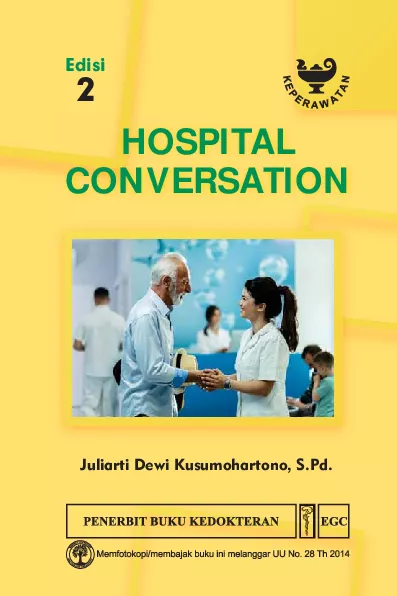 Saat ini tenaga kesehatan profesional sering kali harus menangani klien berkewarganegaraan asing yang tidak jarang hanya menguasai Bahasa Inggris yang merupakan bahasa ibu mereka Adanya tren layanan kesehatan berstandar internasional pun memberi tantangan tersendiri untuk dapat memberikan pelayanan kepada klien asing Pada tingkat institusi pendidikan kesehatan mahasiswa terus dituntut untuk menerapkan pengetahuan dan keterampilan yang diperoleh di kelas pada tatanan klinis baik klien dalam maupun luar negeri Tentu saja pelayanan yang diberikan kepada klien asing membutuhkan kemampuan berbahasa Inggris yang baik agar dapat memberikan penjelasan dan pelayanan secara tepat Hospital Conversation menjadi sebuah buku tepat guna untuk menjawab tantangan dalam dunia kesehatan baik di institusi pendidikan maupun pelayanan Keterampilan komunikasi bahasa Inggris yang spesifik pada dunia kesehatan mulai dari pelayanan unit gawat darurat hingga spesialis dapat dipelajari dan dipahami melalui buku ini Bentuk percakapan yang disertai dengan istilah klinis yang umum digunakan pun dapat dipelajari dengan format yang mudah dipahami oleh pembaca