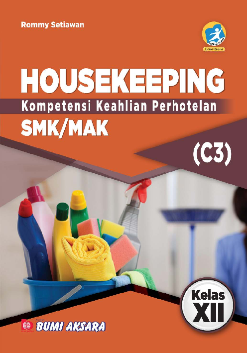 Buku ini ditulis sebagai salah satu sumber belajar siswa SMK MAK kelas XII untuk mempelajari dan memperdalam materi Housekeeping Selain itu buku ini ditulis secara umum dalam rangka ikut serta mencerdaskan bangsa Indonesia di era globalisasi dalam perkembangan ilmu pengetahuan dan teknologi Buku ini disusun berdasarkan Peraturan Direktur Jenderal Pendidikan Dasar dan Menengah Kementerian Pendidikan dan Kebudayaan Nomor 464 D D5 KR 2018 tentang Kompetensi Inti dan Kompetensi Dasar Mata Pelajaran Muatan Nasional A Muatan Kewilayahan B Dasar Bidang Keahlian C1 Dasar Program Keahlian C2 dan Kompetensi Keahlian C3 Anda dapat mempelajari buku ini sebelum dan sesudah dibahas oleh guru dan dapat mendiskusikannya dengan teman agar mendapatkan hasil belajar yang maksimal Setiap bab dalam buku ini dilengkapi dengan Kompetensi Dasar Kata Kunci Peta Konsep Tugas Info Rangkuman Refleksi Diri Soal Latihan dan Tugas Proyek Soal latihan diberikan beberapa jenis setelah akhir bab dan setiap akhir semester Pembahasan materi disajikan dengan bahasa yang lugas dan mudah dipahami dari pembahasan secara umum ke pembahasan secara khusus Sebelum membaca rangkuman materi diharapkan Anda membuat rangkuman sendiri terlebih dahulu yang nantinya dibandingkan dengan rangkuman dalam buku Dengan demikian Anda dapat membandingkan pokok materi yang dianggap penting untuk dirangkum dan meningkatkan pemahaman Anda Pada akhir buku juga dilengkapi dengan Glosarium dan Indeks