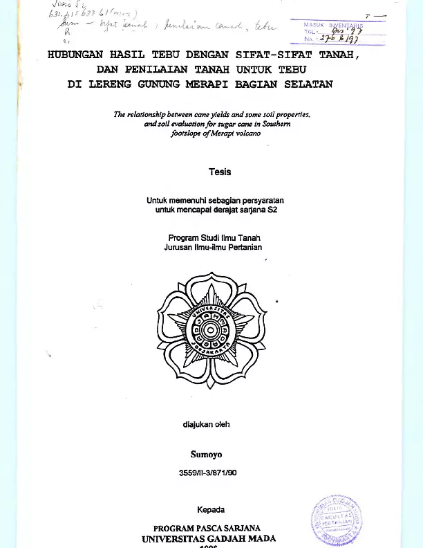 Hubungan Hasil Tebu Dengan Sifat-Sifat Tanah, Dan Penilaian Tanah Untuk Tebu Di Lereng Gunung Merapi Bagian Selatan Sumoyo Fakultas Pertanian UGM Konten Lokal Konten Lokal 31122