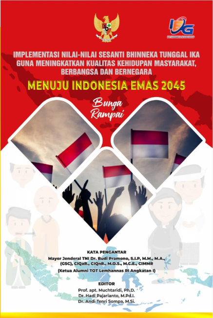 Buku ini membahas Implementasi Nilai Bhinneka Tunggal Ika baik secara teoritik maupun studi kasus merupakan karya anak bangsa dari berbagai penjuru nusantara multi profesi suku dan agama Mereka adalah alumni Training of Trainers ToT Pemantapan Nilai Kebangsaan Angkatan I Tahun 2022 LEMHANNAS Republik Indonesia Sebagai Ketua Alumni saya bangga dengan terbitnya buku ini semoga menjadi kontribusi dalam pengembangan wawasan dan nilai kebangsaan pada ranah yang lebih luas Saya mendorong kepada semua alumni agar terus meningkatkan produktivitasnya bukan hanya pada forum pelatihan Tetapi harus menyebarkan nilai kebangsaan pada semua saluran digital media sosial media cetak elektronik buku prosiding maupun jurnal internasional Untuk apa agar tersosialisasi dengan paripurna dan lahir kehendak yang kuat untuk mengimplementasikan nilai nilai kebangsaan pada semua ranah kehidupan agar Indonesia semakin maju dan bermartabat disegani pada forum internasional dan masyarakatnya siap lahir dan batin menyongsong Indonesia Emas 2045