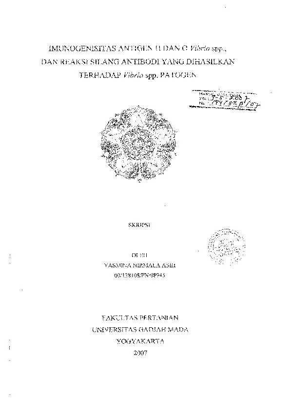 IMUNOGENISITAS ANTIGEN H DAN O Vibrio spp., DAN REAKSI SILANG ANTIBODI YANG DIHASILKAN TERHADAP Vibrio spp. PATOGEN Yasmina Nirmala Asih Fakultas Pertanian UGM Konten Lokal Konten Lokal 48918