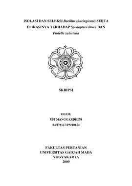 Isolasi Dan Seleksi Bacillus Thuringiensis Serta Efikasinya Terhadap Spodoptera Litura Dan Plutella Xylostella Ufi Manggardhini Fakultas Pertanian UGM Konten Lokal Konten Lokal 31322