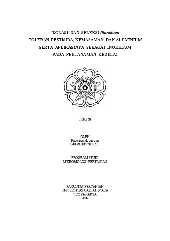 Isolasi Dan Seleksi Rhizobium Toleran Pestisida, Kemasaman, Dan Aluminium Serta Aplikasinya Sebagai Inokulum Pada Pertanaman Kedelai Fransisca Hotmarino Fakultas Pertanian UGM Konten Lokal Konten Lokal 31218