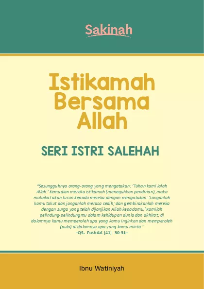 Menjadi istri salehah bukan perkara mudah Setiap Muslimah berharap dirinya akan menjadi istri yang salehah Istri yang berbakti kepada suami dan mengutamakan keluarganya Menyayangi anak anaknya Taat beribadah dan menjaga kehormatan keluarga Jika itu sudah terjadi lewat amal amal saleh yang dilakukannya tindakan selanjutnya adalah istikamah tetap di jalan itu Menjadi orang baik pasti banyak tantangan dan rintangan Oleh karena itu tetap konsisten dalam kebaikan adalah sebuah keutamaan yang luar biasa Buku ini berisi gambaran singkat tentang sifat sifat istri salehah
