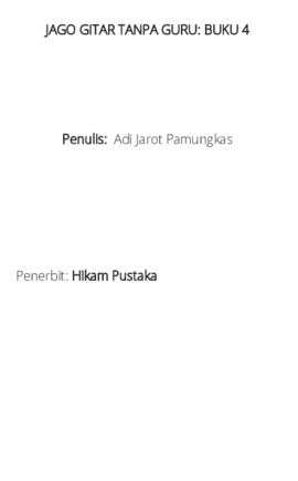 Sinopsis Buku: Jago Gitar Tanpa Guru: Buku 4 Buku ini merupakan bagian dari seri *Jago Gitar Tanpa Guru*, yang ditujukan bagi pemula maupun pemain gitar yang ingin meningkatkan kemampuan bermain gitar secara sistematis. Buku ini menyajikan metode belajar yang sederhana, mudah dipahami, dan praktis, sehingga pembaca dapat langsung bermain gitar dengan baik, baik itu gitar akustik maupun elektrik. Isi buku ini mencakup berbagai teknik dasar dan lanjutan dalam bermain gitar, termasuk teori, teknik dasar, dan latihan praktis. Selain itu, buku ini juga membahas tentang setting gitar, amplifier, dan efek (efx), yang sering diabaikan oleh pemula, namun sangat penting untuk memperkaya kualitas suara dan performa. Dalam bab-babnya, buku ini menjelaskan teknik-teknik seperti *hammer on*, *pull off*, *slide*, dan *vibrato*, yang merupakan teknik dasar dalam memperkaya ekspresi dan keunikan dalam bermain gitar. Setiap teknik disertai dengan penjelasan yang jelas, contoh latihan, dan simbol-simbol yang mudah dipahami dalam notasi tablature. Buku ini menekankan bahwa kualitas bermain gitar tidak hanya bergantung pada bakat, tetapi juga pada minat, kesabaran, dan latihan yang konsisten. Dengan metode belajar yang disajikan, pembaca dapat memperoleh kemampuan bermain gitar yang baik dan menguasai berbagai aliran musik. Dengan struktur yang terorganisir dan penjelasan yang mudah dipahami, buku ini menjadi panduan lengkap bagi siapa pun yang ingin jago bermain gitar tanpa perlu bimbingan guru.
