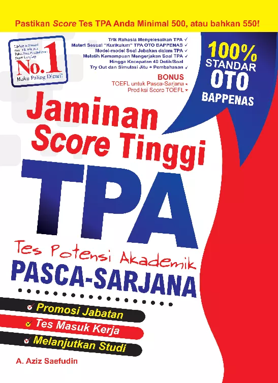 Sinopsis Singkat Buku: "Jaminan Score Tinggi TPA Pasca-Sarjana" Buku ini merupakan panduan lengkap dan terstruktur untuk mempersiapkan diri menghadapi Tes Potensi Akademik (TPA) yang digunakan sebagai bagian dari proses seleksi masuk program studi pascasarjana. Buku ini dirancang untuk membantu calon mahasiswa pascasarjana dalam menguasai berbagai aspek kemampuan yang diujikan dalam TPA, yaitu: kemampuan verbal, kemampuan matematika, logika, dan visualisasi spasial. Buku ini terdiri dari empat bab utama yang disusun secara sistematis dan terperinci, dilengkapi dengan soal-soal latihan serta kunci jawaban dan pembahasan untuk memudahkan pemahaman. Bab-bab tersebut meliputi: 1. Tes Kemampuan Verbal: Meliputi tes padanan kata (sinonim), lawan kata (antonim), padanan hubungan kata, serta perbendaharaan dan pengelompokan kata. 2. Tes Kemampuan Matematika: Meliputi tes seri, aritmatika, perbandingan, dan penalaran aritmatika. 3. Tes Logika: Meliputi tes logika penalaran, perbandingan, analitis, dan verbal. 4. Tes Visualisasi Spasial: Meliputi tes klasifikasi gambar, menyusun bentuk, bayangan cermin, dan gambaran umum. Selain itu, buku ini juga dilengkapi dengan dua simulasi TPA yang mencerminkan bentuk soal dan tingkat kesulitan yang biasa diujikan dalam ujian masuk pascasarjana. Simulasi tersebut dirancang untuk membantu pembaca berlatih secara intensif dan memperkuat kemampuan dalam mengerjakan soal TPA dalam waktu yang terbatas. Dengan mempelajari buku ini, calon mahasiswa pascasarjana diharapkan dapat meningkatkan kemampuan intelektual dan akademik, serta mempersiapkan diri secara optimal untuk melewati ujian TPA dengan hasil yang memuaskan.