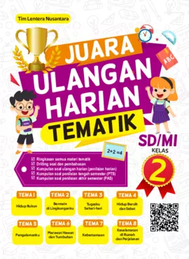 Sinopsis Buku: Buku ini merupakan kumpulan soal dan latihan ulangan harian tematik untuk siswa SD/MI kelas 2, yang disusun berdasarkan kompetensi dasar terbaru yang diterapkan di sekolah, yaitu Peraturan Menteri Pendidikan dan Kebudayaan Nomor 37 Tahun 2018. Buku ini mencakup delapan tema utama yang relevan dengan kehidupan sehari-hari siswa, antara lain: *Bermain*, *Tugasku Sehari-hari*, *Hidup Rukun*, *Hidup Bersih dan Sehat*, *Keselamatan*, *Merawat Hewan dan Tumbuhan*, *Pengalamanku dan Perjalanan*, serta *Kebersamaan di Rumah*. Setiap tema dilengkapi dengan ringkasan materi, soal-soal drilling, pembahasan, serta kumpulan soal ulangan harian, penilaian tengah semester (PTS), dan penilaian akhir semester (PAS). Buku ini dirancang untuk membantu siswa memahami konsep-konsep penting dalam pelajaran PPKn, Bahasa Indonesia, dan tema-tema lainnya, sekaligus mempersiapkan diri menghadapi ujian akhir. Selain itu, buku ini juga mengajarkan sikap dan nilai-nilai keagamaan, keberagaman, serta tanggung jawab sosial yang sejalan dengan ajaran agama dan sila-sila Pancasila. Dengan struktur yang jelas dan pembelajaran yang terstruktur, buku ini menjadi panduan yang tepat untuk meningkatkan pemahaman dan keterampilan belajar siswa.