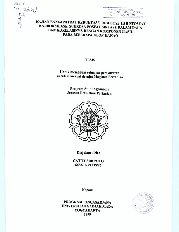 Kajian Enzim Nitrat Reduktase, Ribulose 1,5 Bisfofat Karboksilasi, Sukrosa Fosfoat Sintase Dalam Daun Dan Korelasinya Dengan Komponen Hasil Pada Beberapa Klon Kakao Gatot Subroto Fakultas Pertanian UGM Konten Lokal Konten Lokal 31148