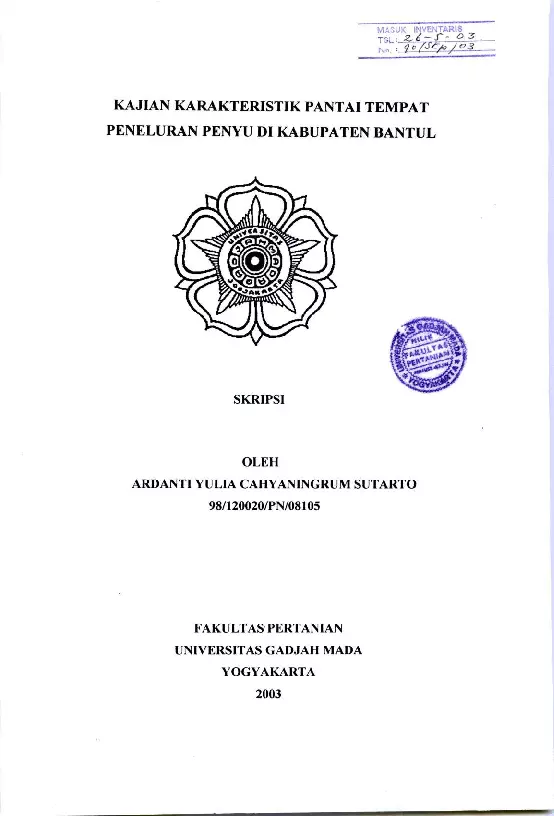 IV HASIL DAN PEMBAHASAN A Posisi Geografis Pantai Hasil pengamatan menunjukkan 3 pantai yang menjadi lokasi peneluran penyu selama bulan Mei sampai dengan Oktober 2002 yaitu Pantai Pandansimo Pantai Patihan dan Pantai Samas Pantai Pandansimo yang terletak di desa Poncosari mempunyai posisi geografis 07 56 58 4 07 59 48 6 LS dan 110 12 13 7 110 14 30 BT Pantai Patihan yang terletak di desa Gadingsari mempunyai posisi geografis 07 57 12 16 0800 12 56 LS dan 110 14 30 110 15 30 BT Pantai Samas yang terletak di desa Srigading mempunyai posisi geografis 07 59 25 13 08 00 34 05 LS dan 110 15 30 110 16 29 18 BT andansimo Patihan batasdesa SiiL Samas jalansetapak u lokasi penelitian perairan 1 pasir pasir pasut S Skala 1 75 000 Sumber Petatopografi Kabupaten Bantul Gambar 3 Peta lokasi penelitian di Pantai Pandansimo Pantai Patihan dan Pantai Samas sebagai lokasi bertelur penyu