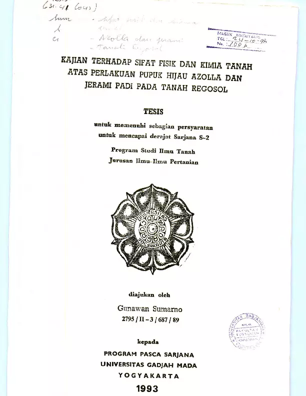 Kajian Terhadap Sifat Fisik Dan Kimia Tanah Atas Perlakuan Pupuk Hijau Azolla Dan Jerami Padi Pada Tanah Regosol Gunawan Sumarno Fakultas Pertanian UGM Konten Lokal Konten Lokal 31108