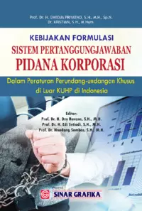 Sinopsis Buku: Buku ini membahas mengenai kebijakan formulasi sistem pertanggungjawaban pidana korporasi dalam peraturan perundang-undangan khusus di luar Kitab Undang-Undang Hukum Pidana (KUHP) di Indonesia. Buku ini berisi analisis mendalam mengenai ketidaksesuaian antara kebijakan perundang-undangan yang dibuat dan kenyataan sosial yang ada di masyarakat, yang dapat menghasilkan undang-undang yang tidak berfungsi dan tidak dapat ditegakkan. Penulis menjelaskan bahwa kebijakan formulasi hukum pidana korporasi yang terdapat dalam berbagai undang-undang khusus di luar KUHP masih tergolong inkonsisten, tidak harmonis, tumpang tindih, dan tidak sinkron. Oleh karena itu, diperlukan upaya untuk merumuskan kebijakan hukum pidana korporasi yang lebih efektif dan sesuai dengan realitas sosial. Buku ini juga menjelaskan bahwa fungsionalisasi hukum pidana sebagai upaya penanggulangan kejahatan dapat dilakukan melalui tiga tahap, yaitu tahap formulasi, tahap aplikasi, dan tahap eksekusi. Tahap formulasi dianggap sebagai tahap yang paling strategis dalam penanggulangan kejahatan, karena merupakan proses penegakan hukum *in abstracto*. Kesalahan pada tahap formulasi dapat menghambat upaya pencegahan dan penanggulangan kejahatan pada tahap aplikasi dan eksekusi. Selain itu, buku ini menyoroti berbagai bentuk kejahatan yang dilakukan oleh perusahaan, seperti pelanggaran kepercayaan, manipulasi, pengelakan peraturan, price fixing, false advertising, kejahatan lingkungan hidup, dan penyalahgunaan kekuasaan ekonomi. Buku ini juga menjelaskan pentingnya konsistensi dan harmonisasi dalam kebijakan hukum pidana korporasi untuk mencegah dan menanggulangi kejahatan yang merugikan negara dan masyarakat luas.