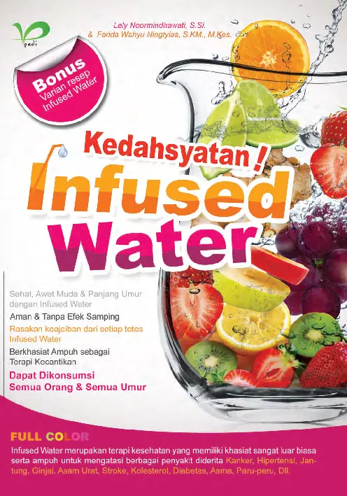 Sinopsis Buku: Buku ini menjelaskan pentingnya air bagi kesehatan tubuh manusia, dengan menekankan bahwa hampir 80% dari tubuh kita terdiri dari air. Dengan memahami bahwa air adalah kebutuhan vital bagi fungsi optimal sistem tubuh, buku ini mengajak pembaca untuk memperhatikan pola konsumsi air sehari-hari. Dalam rangka menjaga kesehatan, buku ini menyoroti kelemahan dari konsumsi minuman berkarbonasi dan berzat aditif, yang dapat berdampak negatif terhadap metabolisme tubuh dan meningkatkan risiko penyakit seperti diabetes mellitus. Sebagai solusi, buku ini memperkenalkan *infused water* sebagai alternatif sehat dan menarik untuk memenuhi kebutuhan cairan tubuh. Dengan menambahkan buah-buahan, sayuran, daun, dan rempah-rempah ke dalam air putih, *infused water* tidak hanya memberikan rasa yang segar dan menarik, tetapi juga kaya akan nutrisi alami, bebas gula, dan bebas zat kimia berbahaya. Buku ini berusaha memotivasi pembaca untuk mengadopsi gaya hidup sehat yang dimulai dari kebiasaan sederhana, yaitu meminum air yang baik untuk kesehatan.