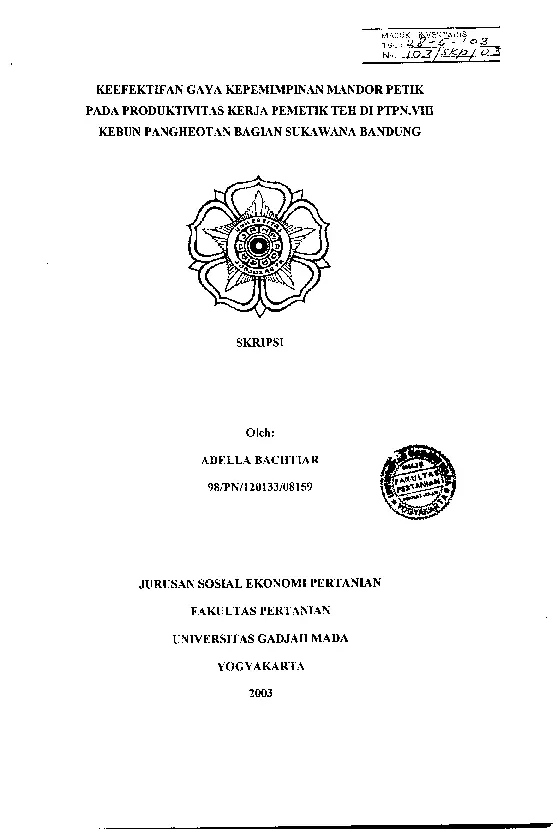 Keefektifan Gaya Kepemimpinan Mandor Petik Pada Produktivitas Kerja Pemetik The Di PTPN VIII Kebun Pangheotan Bagian Sukawana Bandung Adella Bachtiar Fakultas Pertanian UGM Konten Lokal Konten Lokal 48269