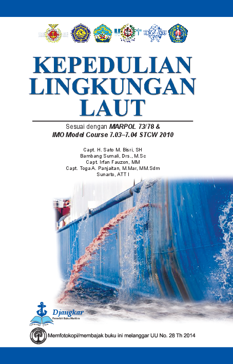 Buku ini disusun untuk memberikan wawasan yang luas kepada para taruna atau perwira di kapal terkait dengan kepedulian mereka terhadap lingkungan laut saat melaut Bab bab penting yang diulas dalam buku ini adalah Perangkat peraturan pencemaran Sertifikat dan dokumen MARPOL Prosedur Pencegahan Pencemaran