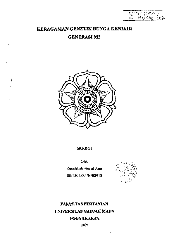III METODE PENELITIAN A Bahan Penelitian Bahan penelitian yang digunakan dalam penelitian ini adalah 10 nomor tanaman kenikir yang mempunyai bentuk mahkota berbelah dengan warna kuning ditambah kontrol Sepuluh nomor ini merupakan hasil seleksi dari tanaman generasi M2 hasil mutasi tanaman Ml menggunakan 0 3 EMS ethyl methane sulfonate dengan lama perendaman 3jam Bunga 10 nomor tanaman M2 sebagai sumber bahan tanam yang memiliki karakter bentuk mahkota berbelah dengan warna kuning Gambar 3 sedangkan kontrol memiliki karakter bentuk mahkota normal dengan warna oranye Gambar 4 Bahan tanam M3 tercantum pada tabel 1 Bahan bahan lain yang diperlukan adalah pupuk kandang Gambar 3 Mahkota belah warna kuning Gambar 4 Mahkota bunga normal warna oranye Tabel 1 Nomor nomor tanaman terpilih hasil seleksi biji generasi M2 sebagai bahan tanam generasi M3 No No tanaman Asal Blok Bentuk Mahkota Warna Mahkota Jumlah Tanaman yang tumbuh 1 113 3 Belah 18 2 78 3 Belah 3 9 3 Belah Kuning Kuning Kuning 48 Kuning Kuning 44 40 4 77 3 Belah 5 59 3 Belah 6 48 2 Belah 7 74 2 Belah Kuning Kuning 6 6 22 8 132 3 Belah Kuning 16 9 49 2 Belah 18 10 29 3 Belah Kuning Kuning 38 11 K 3 Normal Oranye 30
