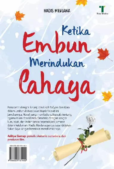 Di tepi Sungai Saskatchewan semua bermula Mulai detik itu gadis Kristen Ortodoks bermata biru itu pun menjelma serupa bidadari surga usai melafaz mantra cinta Dua kalimah syahadat terurai penuh makna Sofyan pemuda Teluk Kuantan sang penyaksi syahadat turut haru bahagia sebab CAHAYA telah menerangi hati KIARA Sementara itu Sofyan masih harus mengungkap secret admirer pemilik mawar putih yang selalu ada di depan apartemennya Olivia dan Zahra yang menaruh hati pada Sofyan pun diduga sebagai pelakunya Termasuk Kiara yang memang sudah jatuh cinta sejak lama Lalu siapakah secret admirer sebenarnya Akankah Kiara tetap istiqamah pada imannya yang masih sangat belia Sementara ayahnya terus memintanya untuk kembali ke agama semula Apakah Sofyan dapat segera melepaskan rindunya pada Emak dan Aini di Teluk Kuantan setelah menghadapi kendala yang mengancam kelulusannya Kepribadian mencerminkan sebuah karya Saya kenal baik dengan penulis novel ini Ternyata hasil karyanya juga baik dan layak dinikmati Mencengkeram wawasan kita sehingga kita dibawa secara halus mengikuti setiap alur cerita di novel ini Cholidi Asadil Alam aktor film Ketika Cinta Bertasbih Penasaran dengan kelanjutan kisah Sofyan dan Kiara dalam Embun di Atas Daun Maple Novel ini jawabannya Novel yang membuka cakrawala tentang agama Islam dan Kristen Ortodoks dengan sangat luas bijak dan indah tanpa terjebak jadi jumawa dalam keislaman Hadis Mevlana pantas saya idolakan Salut Saya sangat berminat memfilmkannya Aditya Gumay penulis skenario sutradara dan produser film