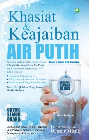 Sinopsis Buku: Buku ini menjelaskan khasiat dan keajaiban air putih dari perspektif ilmiah dan kehidupan sehari-hari. Dalam buku ini, penulis mengupas peran penting air sebagai elemen vital dalam kehidupan manusia, baik sebagai sumber kehidupan, maupun sebagai bahan yang memiliki banyak manfaat dalam berbagai bidang kehidupan, seperti kesehatan, pertanian, industri, dan rekreasi. Penulis juga membahas sifat-sifat air, sumber-sumber air, serta dampak negatif dari pencemaran air, seperti penyebaran penyakit yang disebabkan oleh mikroorganisme seperti *Vibrio cholerae*, *Salmonella typhosa*, *Shigella*, dan *Entamoeba histolytica*. Selain itu, buku ini juga menjelaskan siklus air dan pentingnya pengelolaan air yang bijaksana agar manusia dapat memanfaatkannya secara optimal tanpa merusak lingkungan. Dengan bahasa lugas dan ilmiah, buku ini memberikan wawasan baru tentang cara pandang manusia terhadap air putih sebagai sumber kehidupan yang sangat berharga.