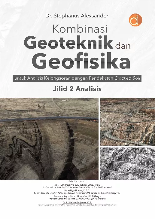 Pemetaan crack berguna untuk menjelaskan alasan kenapa fenomena longsoran terjadi secara parsial atau berspot dan keterbatasan lainnya Kombinasi antara pengujian geofisika dan pengukuran geoteknik di lapangan merupakan kombinasi yang apik dilakukan untuk dapat memberikan hasil yang maksimal Hasil pengukuran dari geolistrik dua dimensi dapat memberikan kontribusi dalam menginterpretasikan model geologi yang dapat digabungkan dengan hasil survei geoteknik Pengujian laboratorium guna mendeteksi adanya cracks yang disajikan dalam buku ini menggunakan metode geolistrik dua dimensi yakni dengan menggunakan induced polarization dan resistivitas Buku ini secara komprehensif memaparkan pula analisis dari studi kasus di lapangan terkait dengan terjadinya longsor yang diakibatkan oleh adanya cracks Buku ini sangat berguna bagi pembaca di lingkungan akademik dan praktis Untuk lingkungan akademik buku ini akan memberikan wawasan baru dan membuka peluang untuk pemgembangan teknik analisa eksperimental dan pemodelan melalui join methods Dalam kebutuhan praktis buku ini membuka jendela baru berupa melalui kajian skala mikroskopis hingga makrokopis atas problem lapangan yang harus diselesaikan Buku ini layak menjadi salah satu referensi tentang pemahaman problem tanah longsor dan juga tentang metode penyelesaiannya Dengan demikian buku ini layak menjadi koleksi perpustakaan pada bidang Teknik Sipil dan juga Teknik Geofisika
