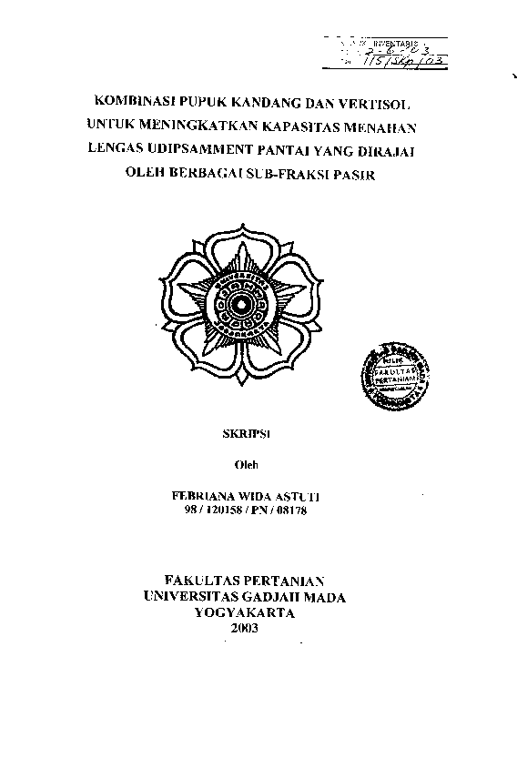 Kombinasi Pupuk Kandang Dan Vertisol Untuk Meningkatkan Kapasitas Menahan Lengas Udipsamment Pantai Yang Dirajai Oleh Berbagai Sub-Fraksi Pasir Febriana Wida Astuti Fakultas Pertanian UGM Konten Lokal Konten Lokal 48489