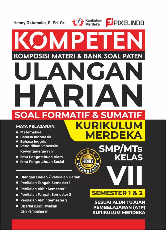 Penerapan Kurikulum Merdeka mendorong siswa dapat menggali potensi yang mereka miliki karena siswa dapat mengekspresikan bakat mereka dalam suasana pembelajaran yang kreatif Dengan begitu pembelajaran akan terasa lebih menyenangkan Begitu juga dengan soal soal di dalam buku ini yang mengimplementasikan penguatan nilai nilai gotong royong mandiri beriman bertakwa kepada Tuhan Yang Maha Esa dan berakhlak mulia bernalar kritis dan berkebhinekaan global Buku ini merupakan senjata ampuh bagi siswa SMP MTs yang ingin naik ke kelas VIII dengan nilai yang memuaskan Buku Kompeten Ulangan Harian untuk SMP MTs Kelas VII ini berisi Kumpulan soalsoal Ulangan Harian Penilaian Tengah Semester dan Penilaian Akhir Semester Mata Pelajaran yang ada di dalam buku ini di antaranya Matematika Bahasa Indonesia Bahasa Inggris Pendidikan Pancasila Kewarganegaraan Ilmu Pengetahuan Alam Ilmu Pengetahuan Sosial Selain berisi soal soal dan pembahasannya buku ini juga berisi ringkasan materi kelas VII dari semester satu sampai semester dua Belajar menjadi lebih mantap dan lebih semangat demi meraih masa depan gemilang