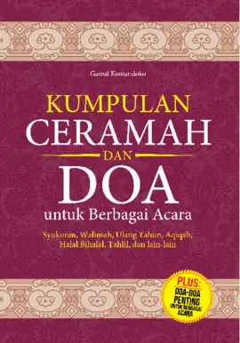 Sinopsis Buku: Buku ini merupakan kumpulan ceramah dan doa yang disusun dengan tujuan untuk membantu pembaca dalam berbagai kesempatan acara keagamaan dan kebudayaan. Buku ini terdiri dari berbagai bab yang membahas topik-topik penting dalam kehidupan beragama, seperti Nisfu Sya’ban, Maulid Nabi, Isra Mikraj, menyambut bulan Ramadhan, peringatan Nuzulul Qur’an, acara Halal Bihalal, Hari Kemerdekaan Republik Indonesia, serta peletakkan batu pertama pembangunan masjid. Selain itu, buku ini juga menyediakan doa untuk berbagai acara khusus seperti ulang tahun untuk diri sendiri, anak, sahabat, perkawinan, permohonan perlindungan, maslahah keluarga, kelapangan hati, dan keselamatan. Buku ini dirancang agar pembaca dapat menggunakan contoh-contoh ceramah dan doa yang disajikan sebagai bekal untuk berbicara di hadapan orang banyak, baik dalam acara resmi maupun kegiatan keagamaan. Penyusun berharap buku ini dapat memberikan manfaat bagi pembaca dan menjadi amal hasanah bagi penyusunnya. Penulis: Gamal Komandoko ISBN (10): 979-878-261-5 ISBN (13): 978-979-878-261-9 Tahun Terbit: 2013 Ukuran Buku: 14 x 20 cm Jumlah Halaman: 200 halaman Hak Cipta Dilindungi Undang-Undang