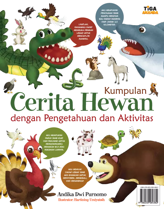 Sinopsis Buku: Buku ini merupakan kumpulan cerita edukatif yang menghadirkan berbagai tokoh hewan dengan karakteristik dan keunikan masing-masing. Dalam setiap cerita, terdapat pesan moral yang menginspirasi pembaca untuk mengembangkan karakter baik, seperti kejujuran, rasa syukur, dan keberanian. Cerita-cerita dalam buku ini tidak hanya menarik dan menarik minat anak-anak, tetapi juga membantu mereka memahami sifat-sifat hewan dan nilai-nilai kehidupan yang terkandung di dalamnya. Buku ini dilengkapi dengan ulasan singkat mengenai ciri-ciri hewan yang muncul dalam cerita, serta aktivitas yang dapat meningkatkan pemahaman dan keterlibatan pembaca. Dengan cerita yang menarik dan pesan yang bermakna, buku ini menjadi panduan yang bermanfaat untuk mengasah pengetahuan dan karakter anak-anak.