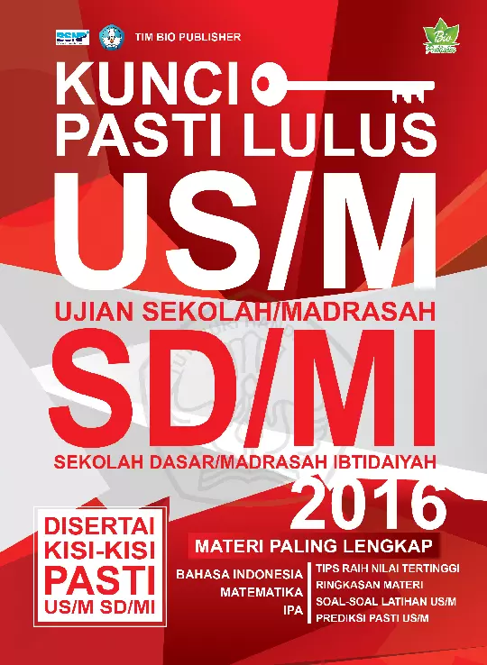 Sinopsis Buku: Buku ini merupakan panduan lengkap dan terpercaya bagi siswa dalam mempersiapkan Ujian Sekolah/Madrasah (US/M) tahun 2016. Buku ini dirancang untuk membantu siswa memahami dan menguasai materi pelajaran Bahasa Indonesia, Matematika, dan IPA sesuai dengan kisi-kisi terbaru. Selain itu, buku ini juga dilengkapi dengan ringkasan materi per indikator US/M, contoh soal, serta paket prediksi soal yang dilengkapi pembahasan lengkap. Dengan pendekatan yang efektif dan terstruktur, buku ini memandu siswa untuk belajar secara mandiri, meningkatkan pemahaman, dan meningkatkan kepercayaan diri dalam menghadapi ujian. Buku ini juga menyajikan tips-tips penting untuk meraih nilai tertinggi, seperti berdoa, berlatih soal secara rutin, belajar kelompok, bersikap jujur, serta menghindari belajar kebut semalam. Dengan menggunakan buku ini, siswa dapat mempersiapkan diri secara maksimal dan berpeluang meraih nilai sempurna serta diterima di SMP/MTs favorit.