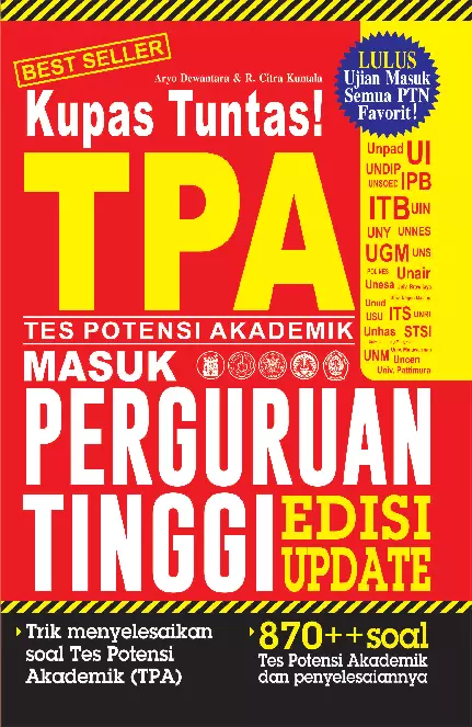 Sinopsis Buku: Buku ini merupakan panduan lengkap dan terstruktur untuk mempersiapkan ujian masuk perguruan tinggi negeri (PTN), khususnya dalam tes potensi akademik (TPA). Buku ini dirancang untuk membantu calon peserta ujian meningkatkan kemampuan berpikir kritis, logis, dan analitis melalui latihan soal-soal yang sesuai dengan model ujian standar SBMPTN dan USM-STAN. Buku ini terdiri dari berbagai bagian yang membahas tiga jenis tes utama dalam TPA, yaitu tes verbal, tes kuantitatif, dan tes penalaran. Setiap bagian dilengkapi dengan contoh soal, penjelasan, dan trik serta tips untuk memudahkan pemahaman dan pengerjaan soal. Selain itu, buku ini juga menyediakan berbagai paket soal ujian standar SBMPTN dan USM-STAN beserta pembahasan yang mendetail, sehingga pembaca dapat memahami konsep dan strategi penyelesaian soal secara efektif. Ditulis oleh Aryo Dewantara dan R. Citra Kumala, buku ini merupakan referensi yang sangat berguna bagi para pelajar yang ingin meningkatkan kemampuan akademik dan mempersiapkan diri secara matang untuk ujian masuk PTN. Dengan berlatih secara teratur dan memahami konsep-konsep yang disajikan, pembaca dapat meningkatkan peluang kelulusan dan memperoleh hasil yang optimal dalam ujian.