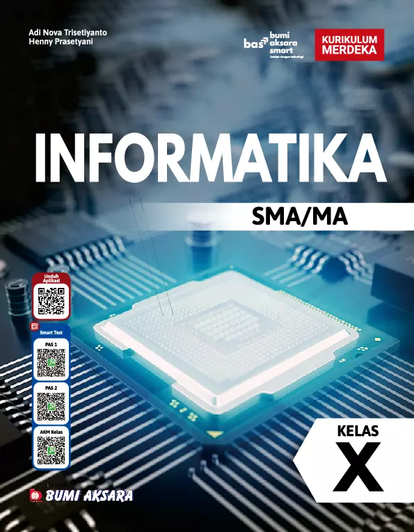 Buku Informatika Kelas X ini dibuat berdasarkan Capaian Pembelajaran Kurikulum Merdeka dengan penyajian yang mendekatkan siswa dengan ilmu pengetahuan sehingga siswa dapat melihat penerapan ilmu pengetahuan dalam kehidupan sehari sehari Fenomena yang terdapat di lingkungan sekitar merupakan sumber belajar bagi siswa Buku ini merupakan buku referensi sekaligus buku yang memuat banyak aktivitas siswa baik yang dilakukan secara perorangan ataupun berkelompok sehingga siswa lebih aktif dalam pembelajaran Buku ini dilengkapi dengan literasi digital yang disajikan dengan ikon bas bumi aksara smart dimana siswa siap belajar dengan teknologi bas bumi aksara smart terdiri atas Smart Learning QR Code untuk materi pembelajaran interaktif video youtube dan situs situs info update Terdapat di dalam materi pembahasan Smart Test QR Code untuk soal PAS 1 soal PAS 2 dan soal AKM Kelas Terdapat pada kover buku Smart Quiz QR Code untuk soal latihan akhir bab Terdapat pada akhir setiap bab Dengan adanya bas bumi aksara smart siswa diharapkan mempunyai kemampuan belajar mandiri serta menguji kemampuan dan pemahaman siswa terhadap materi Dengan mempelajari buku ini diharapkan dapat meningkatkan kemampuan berpikir siswa sehingga dapat memecahkan masalah yang ditemukan dalam kehidupan sehari hari Untuk mengakses konten konten dalam bas bumi aksara smart unduh aplikasi dari QR Code pada kover depan buku