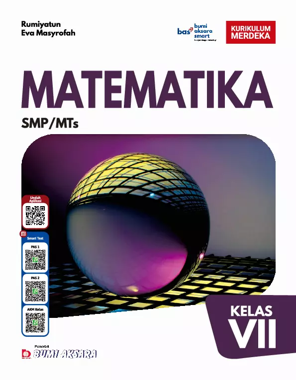 Buku Matematika Kelas VII ini dibuat berdasarkan Capaian Pembelajaran Kurikulum Merdeka dengan penyajian yang mendekatkan siswa dengan ilmu pengetahuan sehingga siswa dapat melihat penerapan ilmu pengetahuan dalam kehidupan sehari sehari Fenomena yang terdapat di lingkungan sekitar merupakan sumber belajar bagi siswa Buku ini merupakan buku referensi sekaligus buku yang memuat banyak aktivitas siswa baik yang dilakukan secara perorangan ataupun berkelompok sehingga siswa lebih aktif dalam pembelajaran Buku ini dilengkapi dengan literasi digital yang disajikan dengan ikon bas bumi aksara smart dimana siswa siap belajar dengan teknologi bas bumi aksara smart terdiri atas Smart Learning QR Code untuk materi pembelajaran interaktif video youtube dan situs situs info update Terdapat di dalam materi pembahasan Smart Test QR Code untuk soal PAS 1 soal PAS 2 dan soal AKM Kelas Terdapat pada kover buku Smart Quiz QR Code untuk soal latihan akhir bab Terdapat pada akhir setiap bab Dengan adanya bas bumi aksara smart siswa diharapkan mempunyai kemampuan belajar mandiri serta menguji kemampuan dan pemahaman siswa terhadap materi Dengan mempelajari buku ini diharapkan dapat meningkatkan kemampuan berpikir siswa sehingga dapat memecahkan masalah yang ditemukan dalam kehidupan sehari hari Untuk mengakses konten konten dalam bas bumi aksara smart unduh aplikasi dari QR Code pada kover depan buku