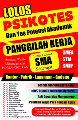 Melamar pekerjaan adalah hal yang mudah hanya memberikan setumpuk surat lamaran dan mengajukannya keHRD perusahaan Namun hal tersulitnya adalah ketika harus menghadapi Tes PSIKOTES Karena dibagian inilah HRD di semua perusahaan akan menilai sampai dimana tingkat kepandaian dan kemampuan calon karyawan tersebut Buku Lolos Psikotes Dan Tes Potensi Akademik Panggilan Kerja SMA ini berisi kumpulan soal yang meliputi Tes Analogi Tes Antonim Tes Sinonim Tes Ketelitian Tes Peribahasa Tes Aritmatika Tes Matematika Tes Deret Huruf Tes Bahasa Inggris Tes Konsistensi Logis Tes Memasang Bagian Gambar Tes Klasifikasi Gambar Tes Informasi Singkat Tes Aljabar Objek Tes Bahasa Indonesia Tes Deret Angka dan Tes Perbendaharaan Kata Buku yang diterbitkan oleh penerbit Lembar Media merangkum kumpulan soal soal yang dapat digunakan sebagai latihan menghadapi ujian agar anda tidak merasa canggung saat menjalani ujian yang sebenarnya