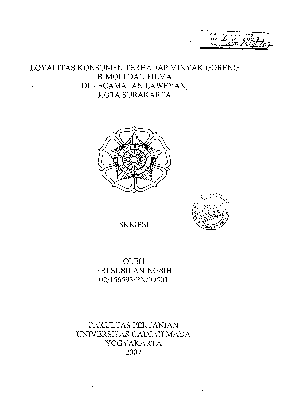LOYALITAS KONSUMEN TERI-IADAP MINYAK GORENG BIMOLI DAN FILMA DI KECAMATAN LAWEYAN, KOTA SURAKARTA Tri Susilaningsih Fakultas Pertanian UGM Konten Lokal Konten Lokal 48818