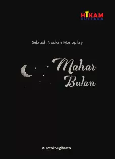 Sinopsis: Buku ini menghadirkan sebuah naskah monoplay berjudul *Mahar Bulan* yang ditulis oleh R. Totok Sugiharto. Cerita ini menggambarkan dunia yang penuh konflik, kritik, dan refleksi sosial melalui dialog dan adegan yang penuh makna. Dalam naskah ini, terdapat berbagai tokoh yang mewakili lapisan masyarakat, seperti pejabat, pengusaha, pelawak, mahasiswa radikal, dan penyair, yang saling berinteraksi dan bertentangan dalam suasana yang penuh drama. Adegan utama terjadi di sebuah panggung yang menjadi tempat pertunjukan monolog dan dialog, di mana para tokoh mengungkapkan pikiran, perasaan, dan kebenaran yang tersembunyi. Dalam salah satu adegan, seorang pelawak mengkritik seorang pengusaha yang menilai pelawak-pelawak sering kali tidak lucu, sementara pelawak tersebut membalas dengan humor dan kritik yang tajam namun cerdas. Cerita ini tidak hanya menghibur, tetapi juga mengajak pembaca untuk berpikir kritis tentang peran masyarakat, kebenaran, dan nilai-nilai sosial yang tersembunyi. Dengan bahasa yang sederhana namun dalam, naskah ini memberikan pandangan yang relevan dengan kehidupan sehari-hari dan menggambarkan keindahan serta kegelapan dalam kehidupan manusia.