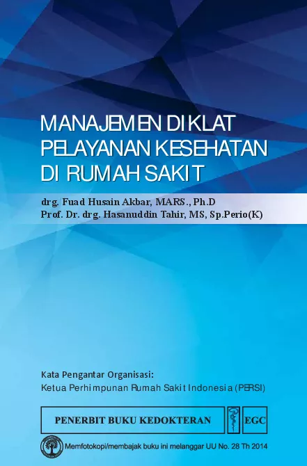 Buku Manajemen Diklat Pelayanan Kesehatan di Rumah Sakit diterbitkan dengan tujuan memberikan penjelasan mengenai pentingnya merancang model diklat sesuai kebutuhan rumah sakit dalam rangka meningkatkan kinerja rumah sakit Buku ini terdiri dari 4 bab bab pertama memuat tentang pengantar kepemimpinan selanjutnya pada bab dua berisi konsep manajemen organisasi bab tiga berisi tentang manajemen pelayanan kesehatan dan selanjutnya pada bab terakhir berisi tentang model rancangan pelatihan Buku ini diharapkan menjadi acuan bagi semua rumah sakit dalam merancang suatu pelatihan Pengembangan kompetensi SDM ini tidak terbentuk dengan otomatis Kompetensi harus dikembangkan secara terencana agar menjadi kekuatan untuk mendukung pencapaian tujuan rumah sakit Strategi pengembangan SDM pada dasarnya tidak hanya melalui pendidikan dan pengembangan keterampilan tetapi ada banyak cara untuk mengembangkannya Strategi pengembangan SDM Satu di antara upaya peningkatan mutu dan profesionalisme tenaga kesehatan yang bekerja di rumah sakit diperlukan suatu pelatihan untuk meningkatkan kinerja dan meningkatkan pelayanan prima