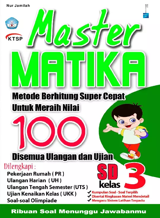 Sinopsis Buku PR Matematika Kelas 3 Buku ini merupakan panduan terstruktur dan komprehensif untuk memperkuat pemahaman siswa kelas 3 dalam pelajaran Matematika. Buku ini disusun berdasarkan Kurikulum Tingkat Satuan Pendidikan (KTSP), sehingga sangat relevan dengan materi pelajaran sekolah dan bisa menjadi bahan tambahan belajar di rumah. Buku ini mengandung pembahasan yang jelas dan terpadu, disertai latihan soal yang beragam untuk memastikan siswa paham konsep yang diajarkan. Setiap bab disusun dengan metode berhitung super cepat, yang bertujuan untuk membantu siswa memahami materi, mempelajari jalan termudah dan tercepat dalam menyelesaikan soal, serta mengasah kemampuan berpikir kritis. Materi yang disajikan mencakup berbagai topik penting dalam Matematika, seperti bilangan, operasi hitung penjumlahan dan pengurangan, operasi hitung perkalian dan pembagian, pengukuran, pecahan, serta bangun datar. Setiap bab dilengkapi dengan soal-soal ulangan harian, soal-soal pekerjaan rumah (PR), dan juga soal-soal yang sering muncul dalam ujian kenaikan kelas (UKK) serta olimpiade. Buku ini juga mencakup soal-soal latihan yang bervariasi dan menantang, sehingga mempersiapkan siswa untuk menghadapi berbagai jenis soal dalam ujian. Dengan pendekatan yang praktis dan terstruktur, buku ini dirancang untuk memudahkan siswa dalam mempelajari Matematika, meningkatkan kepercayaan diri, dan memperkuat kemampuan berhitung secara efektif. Dengan latihan yang cukup dan strategi yang tepat, siswa dapat menyelesaikan setiap soal Matematika dengan mudah dan cepat. ISBN : 978-602-9340-21-1 Kunciaksara@gmail.com